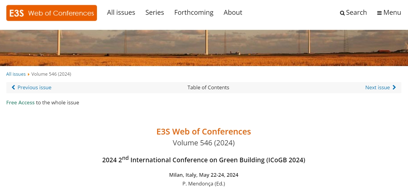 2024 2nd International Conference on Green Building (ICoGB 2024) has been published by "E3S Web of Conferences" (eISSN: 2267-1242, Volume 546), and indexed by Scopus and other major databases.